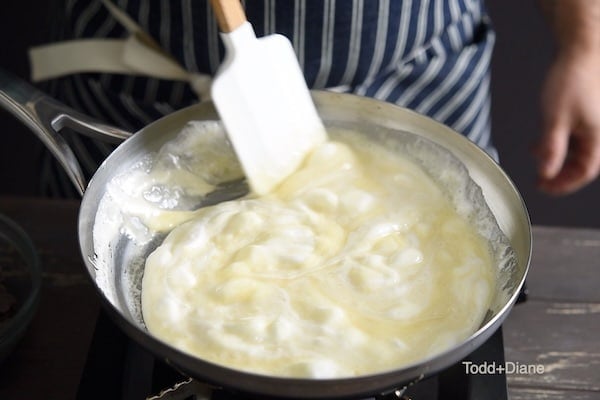 - Remove from heat and stir in the 12 oz. chocolate chips.