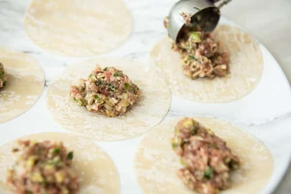 - Lay out half the wrappers and add about 1 Tablespoon (15ml) of the filling in the center of each wrapper. Don’t spread the meat out too much because you don’t want the meat to ooze out the edges during the waffle cooking. Keep the meat in the center of the wrapper (kind of like making a ravioli).