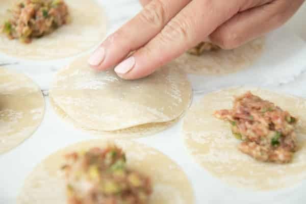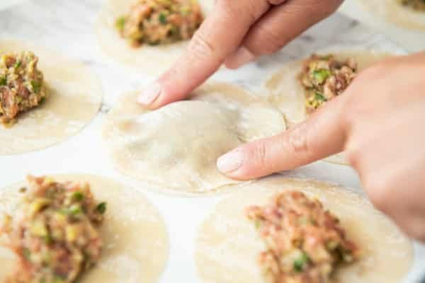 - Then press down the sides of the wrapper to secure the filling in the center, creating a little ball of filling.