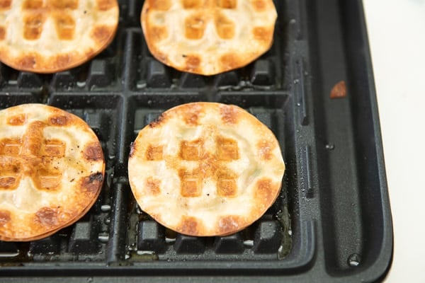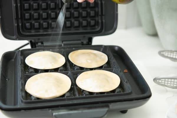- Lightly brush or spray the waffle iron. Place the stuffed wrapper in the waffle iron and brush or spray the top with oil.