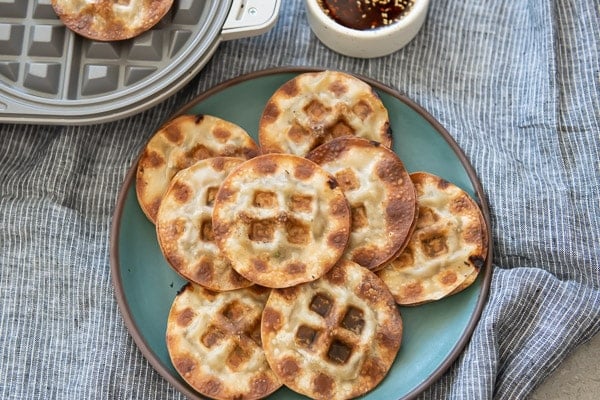 The concept is simple and the results are delcious. Just stuff some egg roll or dumpling filling between two egg roll or wonton wrappers. Heat up the waffle maker and within minutes you have a crispy, savory egg roll waffle. It blew us away at how quick, simple and absolutely crispy these savory waffles turned out. Our nephews, family and friends devoured them so fast, it was hard to keep up with just one waffle iron. These were just as delicious as our viral crispy smashed egg roll dumplings.