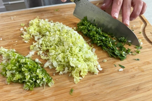 - Make sure to finely mince the vegetables so they don’t poke through the wrappers. If you want, you can also use a little food processor, but that’s another thing to wash so we just usually hand chop.