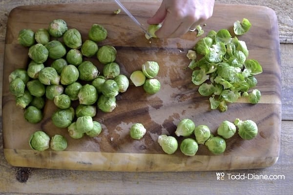 - Peel the outer, bruised layers of the brussels sprouts off. Trim the ends, then cut brussels sprouts in half or quarters (for small brussels sprouts, cut them in half, and for large brussels sprouts, quarter them for more even cooking).